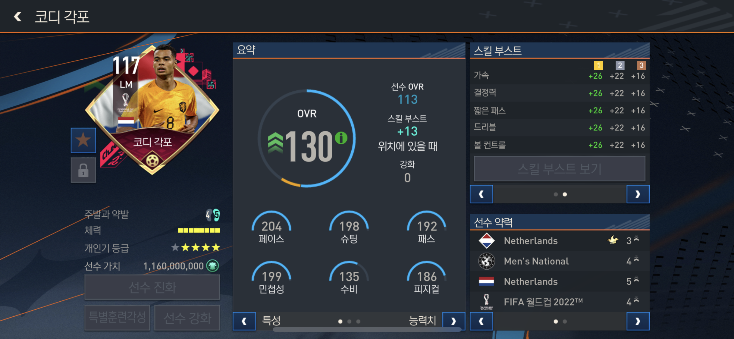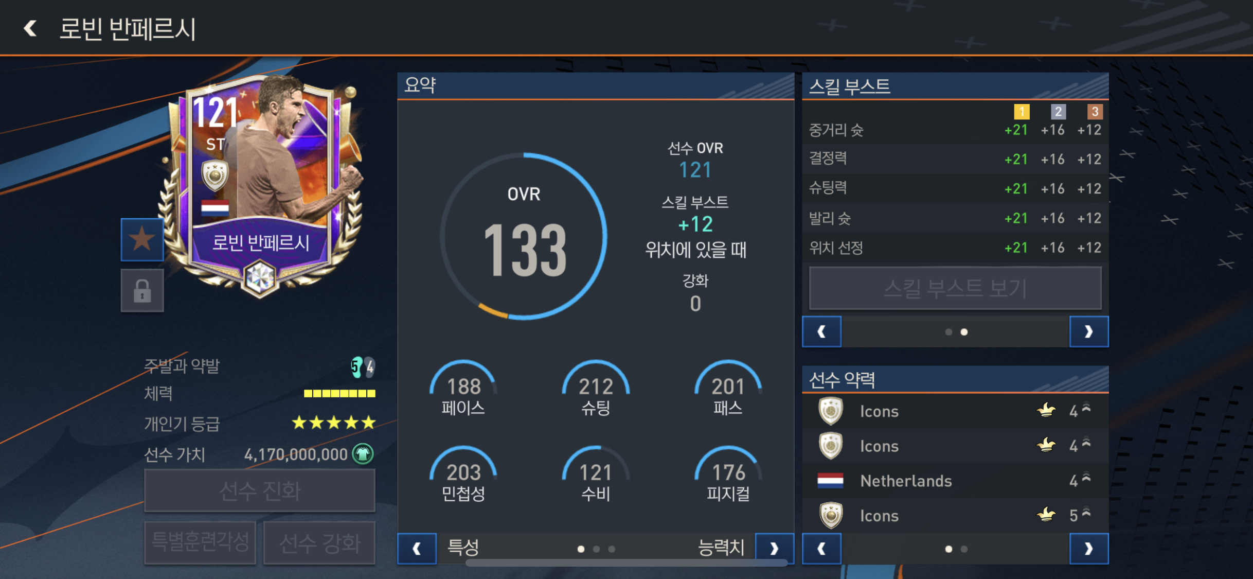특별속성 으로는 화려한 개인기, 중거리슛 선호, 빠른드리블