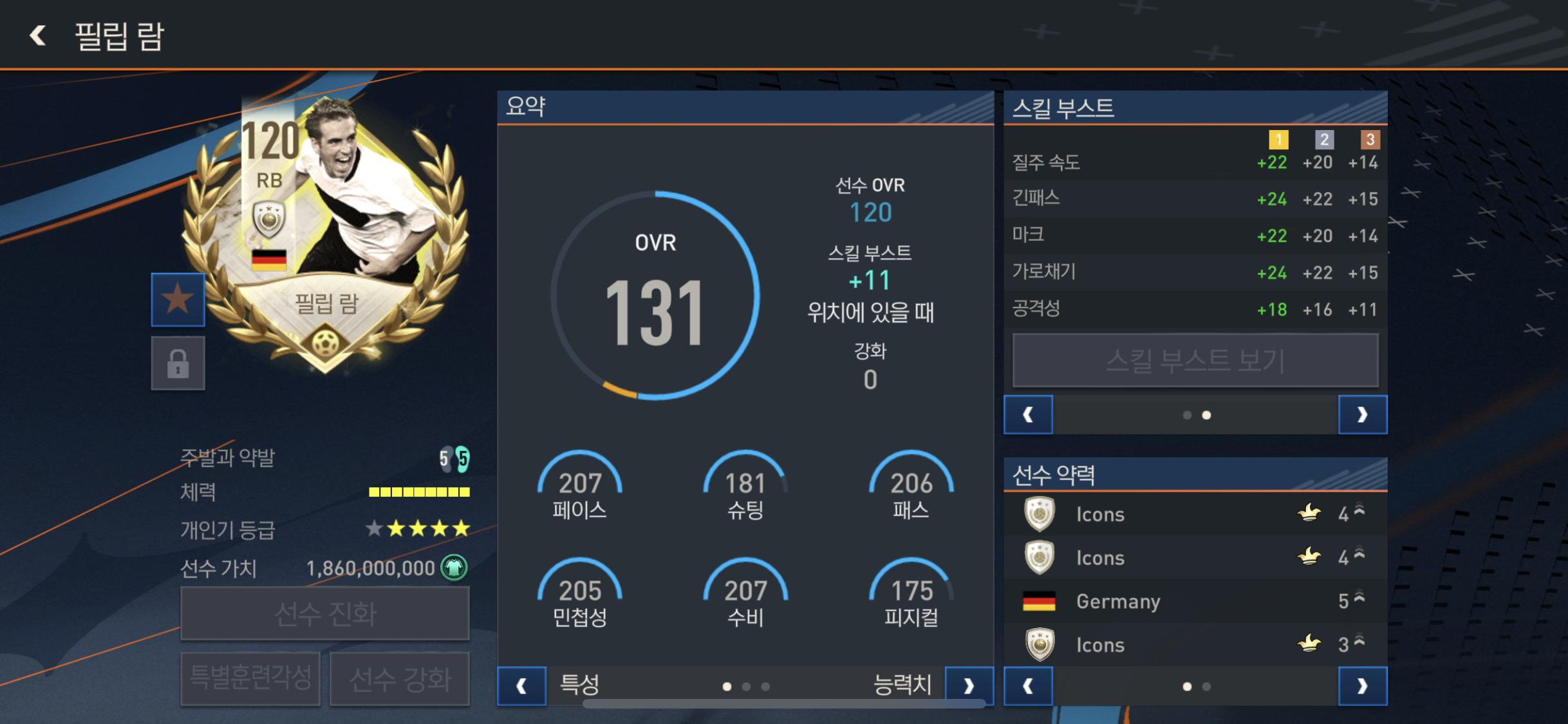꾸준한선수, 빠른드리블, 플레이메이커, 강력한헤더, 군중선호, 화려한걷어내기!